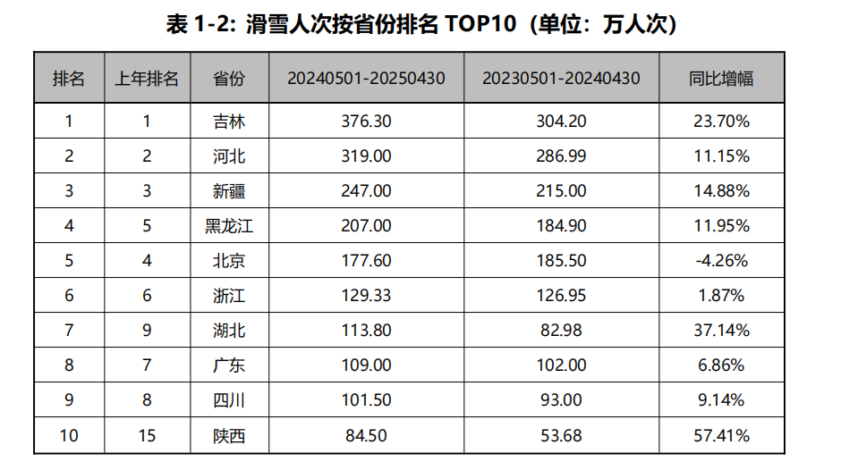 按省份分布,吉林、河北、新疆在全國滑雪人次分布中蟬聯(lián)前三甲,其中吉林省以376.3萬滑雪人次遙遙領先全國。