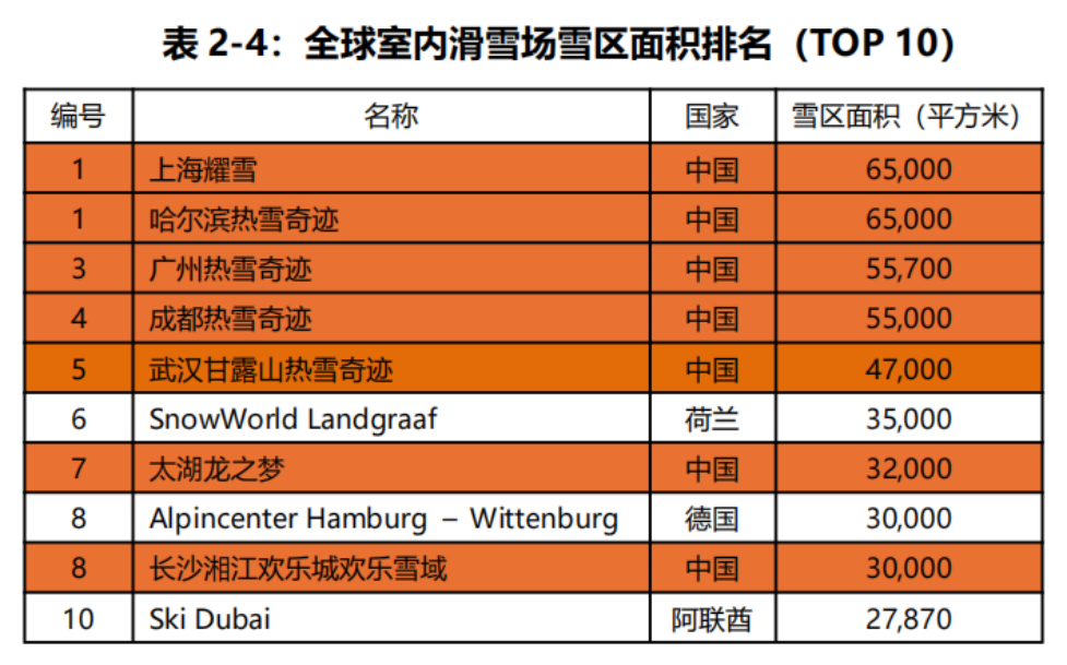 在國際對比中,中國已成為室內滑雪場的絕對領跑者。全球雪區(qū)面積排名前十的室內滑雪場中,中國占據(jù)七席,且前五名全部位于國內,其中上海耀雪、哈爾濱熱雪奇跡面積最大,超過6萬m²。隨著深圳、長春等新項目的投入運營,中國在室內滑雪場全球前十中的占比預計將達到九席。