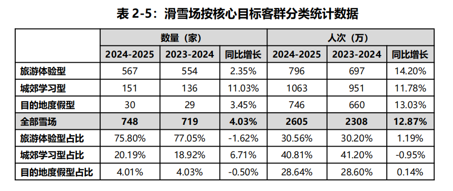 具體來看,旅游體驗型雪場數(shù)量占比最大,達到75.8%,成為覆蓋最廣、最普及的雪場類型。城郊學習型雪場雖然數(shù)量僅占20.19%,但增速最快,累計服務滑雪人次最多,達到1063萬,在培養(yǎng)初級滑雪用戶和普及滑雪運動方面發(fā)揮著重要作用。符合目的地度假型特征的雪場共有30家,比上年增加1家,但滑雪人次增長了13.03%,共創(chuàng)造746萬滑雪人次,占全國總人次的28.64%。雖然數(shù)量僅占4%,但貢獻了近三分之一的滑雪人次,其中吉林“三萬一湖”滑雪度假區(qū)、新疆阿勒泰三大雪場以及河北崇禮集群,已成為國內度假型雪場的典型代表。據(jù)新華社報道,去年進入11月后,可可托海國際雪場日均游客量超過2000人,其中90%的游客來自外省,顯示出目的地度假型雪場在吸引深度滑雪消費群體和帶動消費方面具有極強的拉動力。