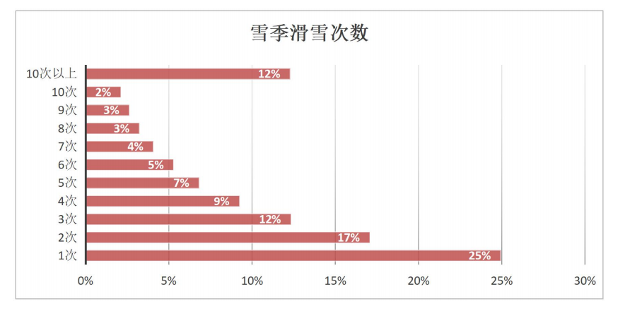 根據(jù)滑唄數(shù)據(jù),在雪季滑雪次數(shù)上,低頻用戶仍占據(jù)主體,25%的用戶每季只滑一次,17%的用戶滑兩次,合計超過四成,顯示出滑雪對大量消費者而言仍是一種體驗型消費。而每季滑3–5次的群體占比約28%,構成了從初學向進階過渡的中堅層。核心用戶雖然數(shù)量有限,但依然具備市場支撐力,約30%的滑雪者每季滑雪超過6次,其中12%的用戶超過10次,體現(xiàn)出穩(wěn)定的消費黏性。
